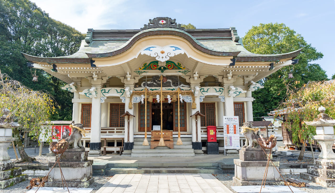 白い社殿が特徴的な武雄神社。武雄を代表するパワースポット「武雄の大楠」と2本の檜の根元と枝がつなぎあっていると言われる「夫婦檜」も縁結びスポットとして人気です。