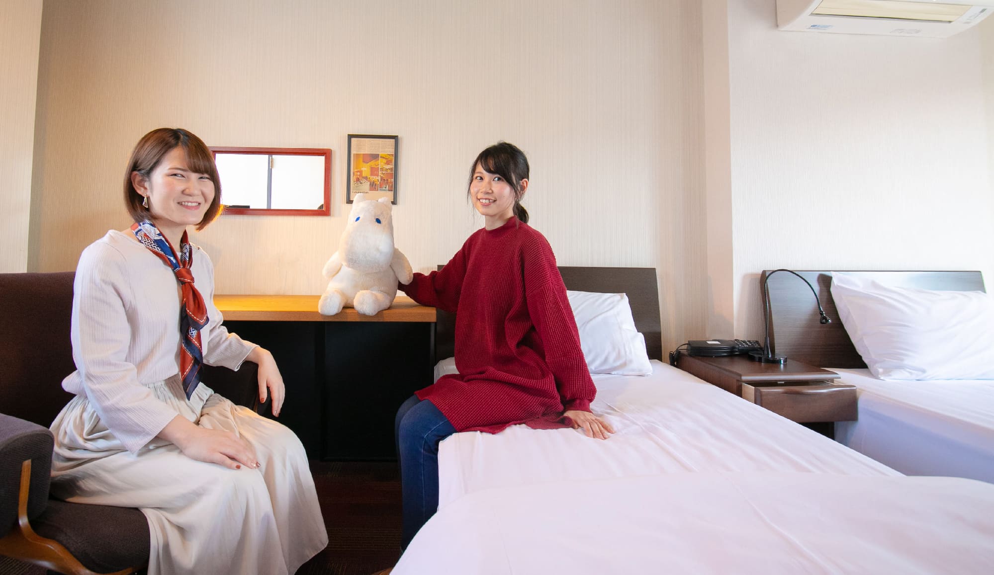 パーソナルホテルYOUでは落ち着きのあるシンプルな客室をご用意しております。気のおけないお友達同士、旅の夜は思いっきり語り明かしちゃいましょう!